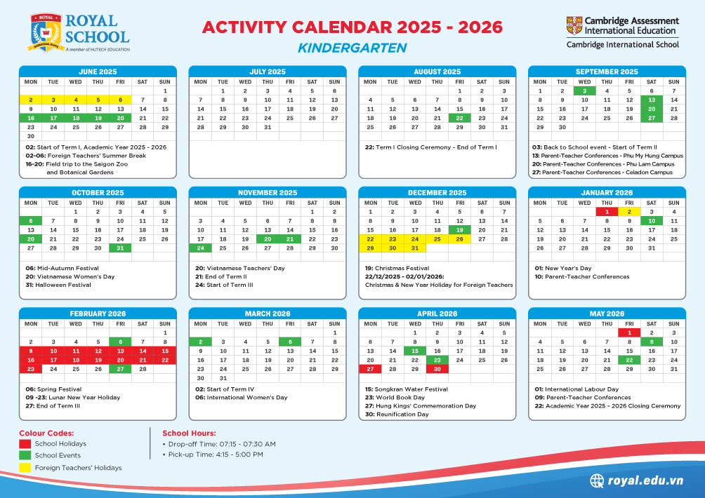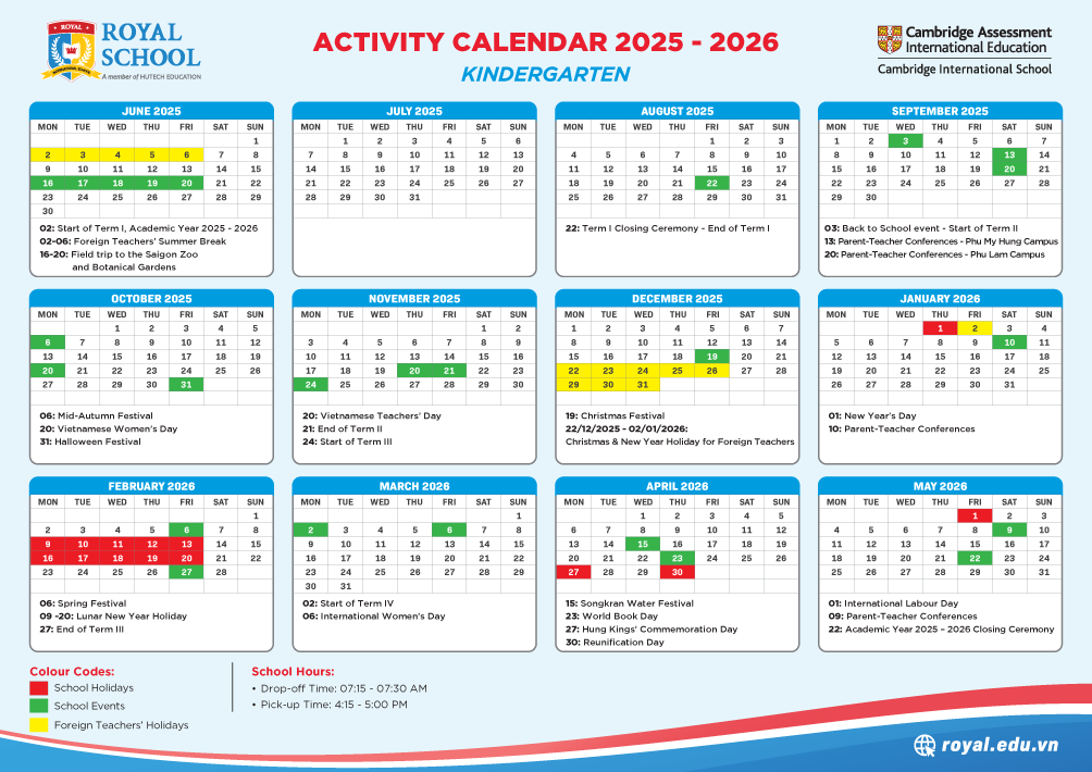 The school also focuses on taking care of each student with the most balanced diet to help them develop comprehensively. In order to ensure the flow of information between the school and parents about the student’s learning, ROYAL SCHOOL will send detailed schedules every week to parents. Accordingly, parents can generally follow how the students spend a day at school as follows: