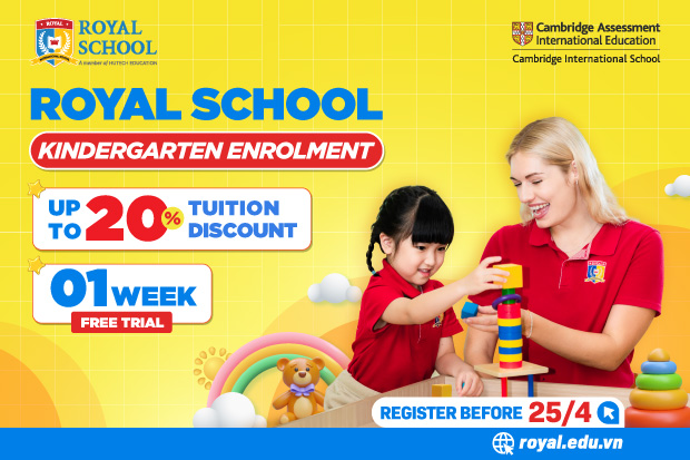 This discount applies to kindergarten students enrolling at Royal School for the 2025-2026 academic year when parents register their children before 25 April, 2025. Additionally, students will receive a free one-week trial to experience the learning environment and meet new friends.